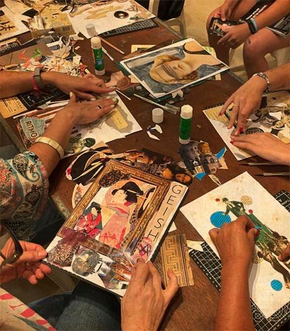 Pasado ese mes recortando, el artista emprende el camino de elaborar la obra. Escuchando música de los 30, deja la mente libre cualquier lógica y permite que sea todo el material recortado quien le ayude a crear la obra final. De esta manera, este segundo día realizaremos collages, conociendo:
